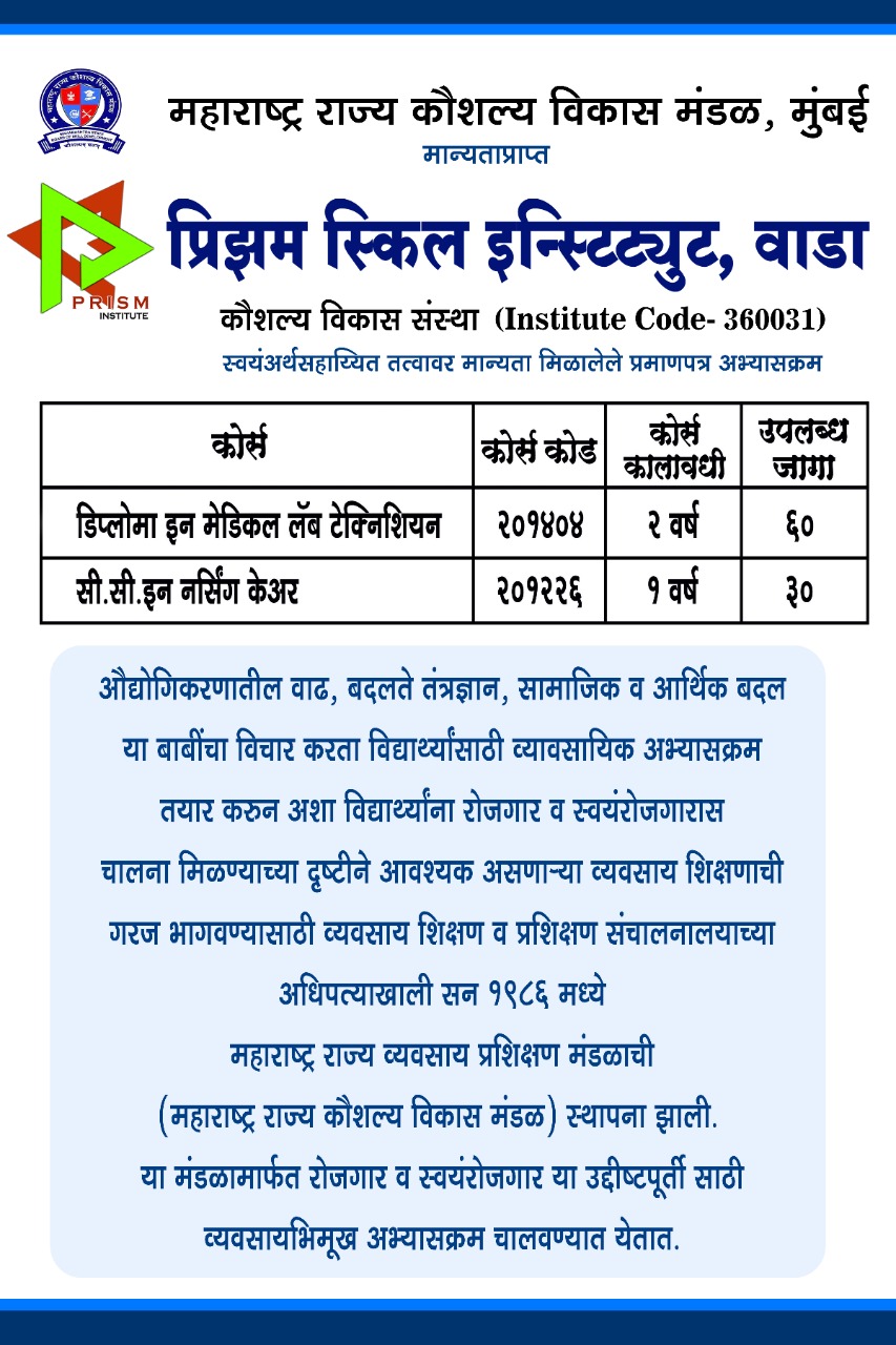 Prism Skill Institute is an advance Health care skilling institute in Wada, Maharashtra. It stives to elevate the quality of skilled resources sector by providing requisite skill to allied health professional and making them employable and ready for the work. It offers a wide range of educational & Training programs including career training join with Prism Skill Institute and make your career in paramedical field.